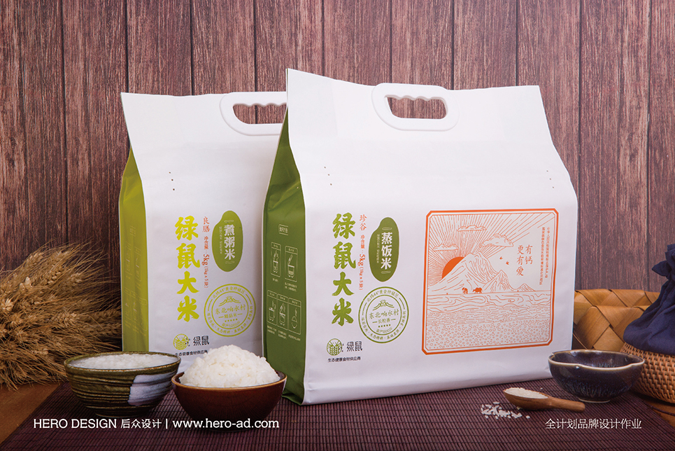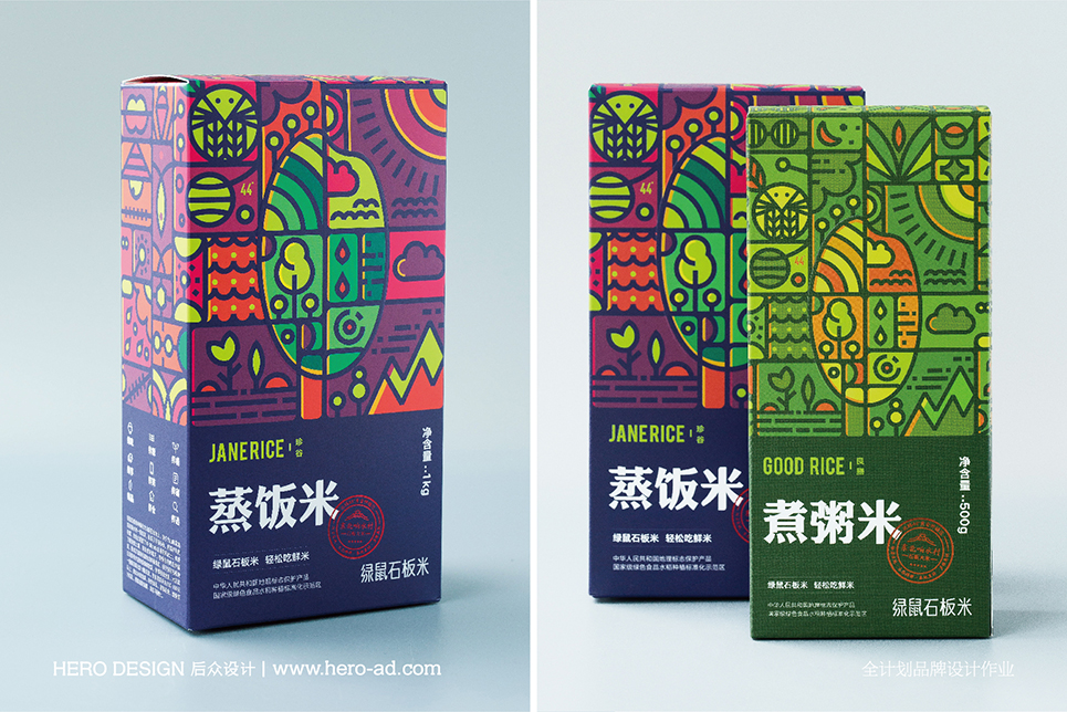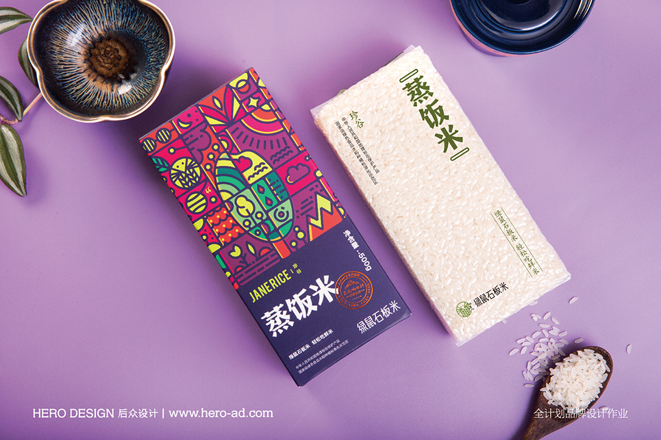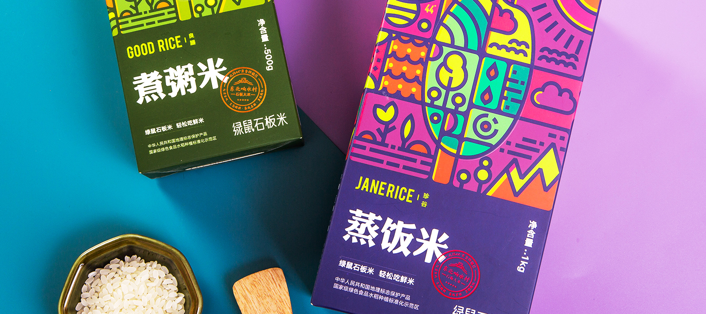 針對年輕人對于谷物產(chǎn)品的陌生感,結(jié)合90后、00后居家做飯時小食量、高品質(zhì)的屬性,后眾設(shè)計與綠鼠食品共同開發(fā)出小容量時尚裝蒸飯米、煮粥米,以東北響水石板米為基礎(chǔ),通過名稱的直觀表達(dá)消解年輕人的選購及蒸煮疑慮。整體包裝風(fēng)格以插畫形式為主,通過各種扁平風(fēng)格元素的搭配,傳遞出健康、自然、美味的核心內(nèi)容。