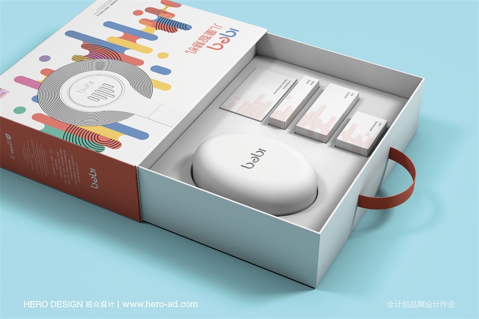 包裝設(shè)計主畫面以“音波”的形式表現(xiàn),“音波”是IQEQ兒童智慧機的主要工作原理,通過將“音波”進行創(chuàng)意化設(shè)計,運用豐富的顏色變化進行拓展,在體現(xiàn)童趣感的同時也體現(xiàn)了產(chǎn)品的科技屬性。
