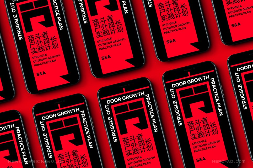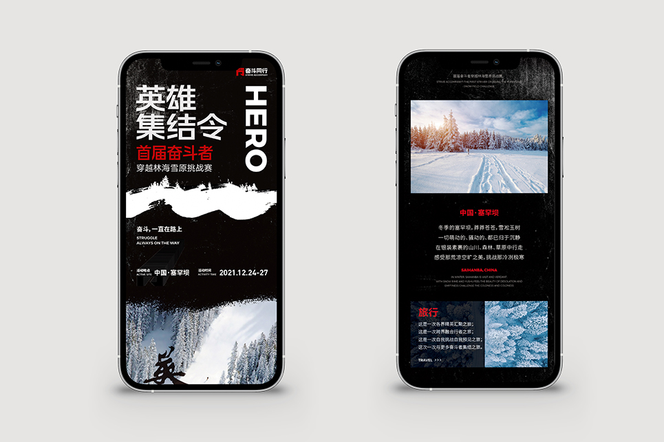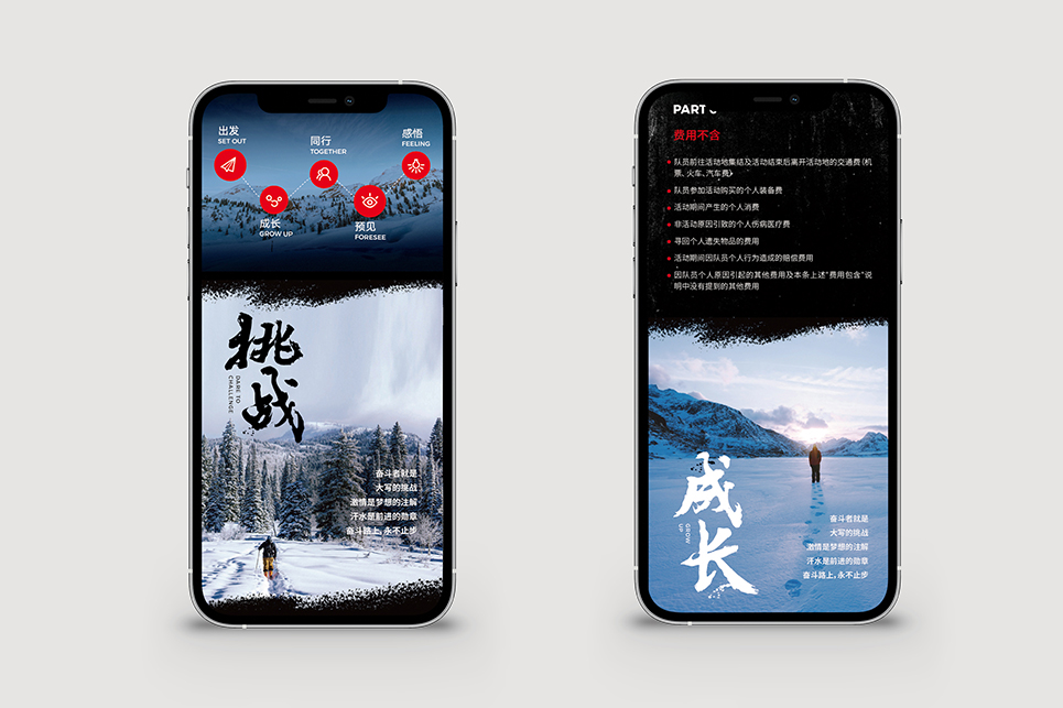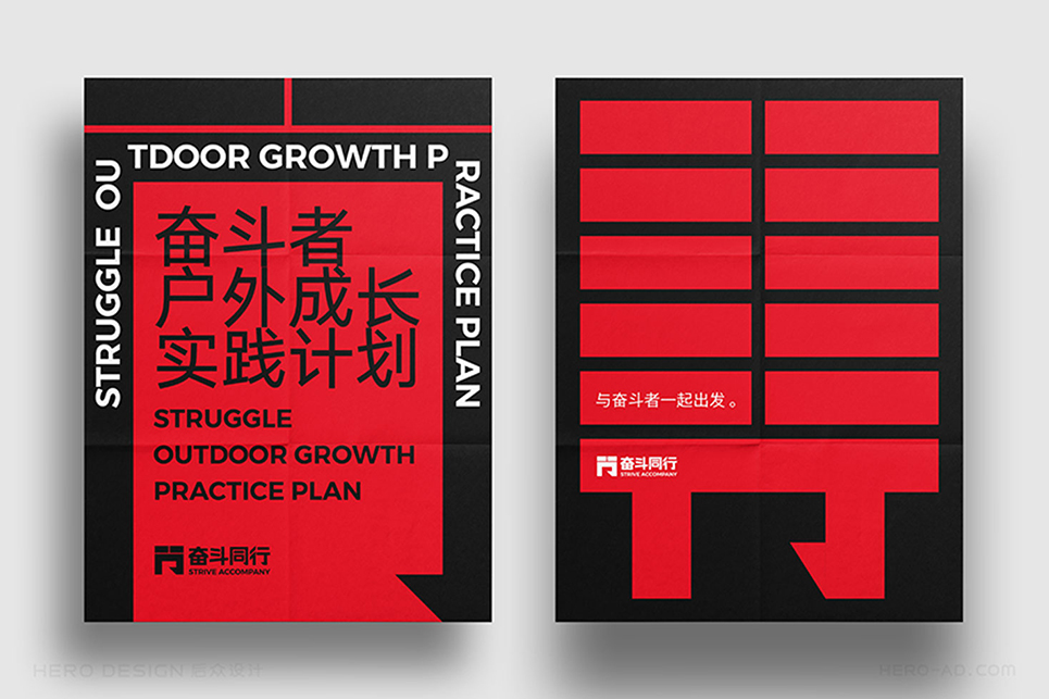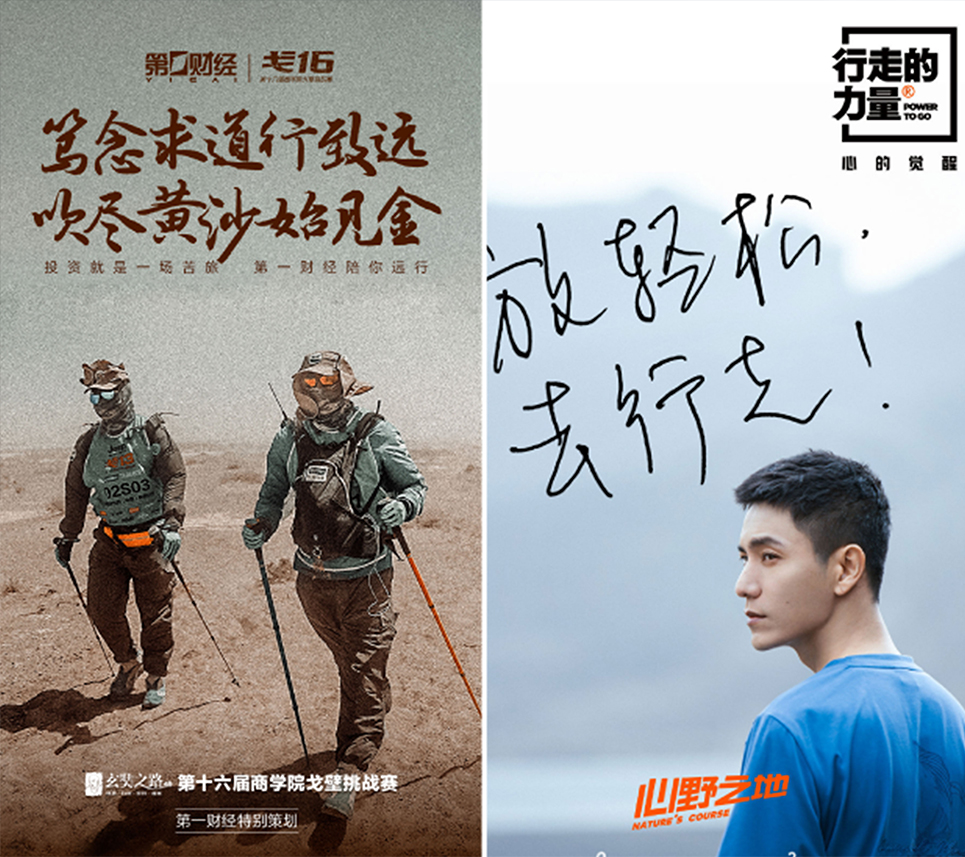 “奮斗同行”作為奮斗學院的戶外研學實踐項目,是具有獨立IP氣質(zhì)的存在,與奮斗學院日常商業(yè)分享類項目不同,“奮斗同行”的底色是運動與拼搏,這就使得項目品牌形象在傳播推廣過程中必須保證對人們渴望征服、期待成長、挑戰(zhàn)超越的情感保持一致,能夠通過視覺的力量,感召人們對于自然世界的向往。